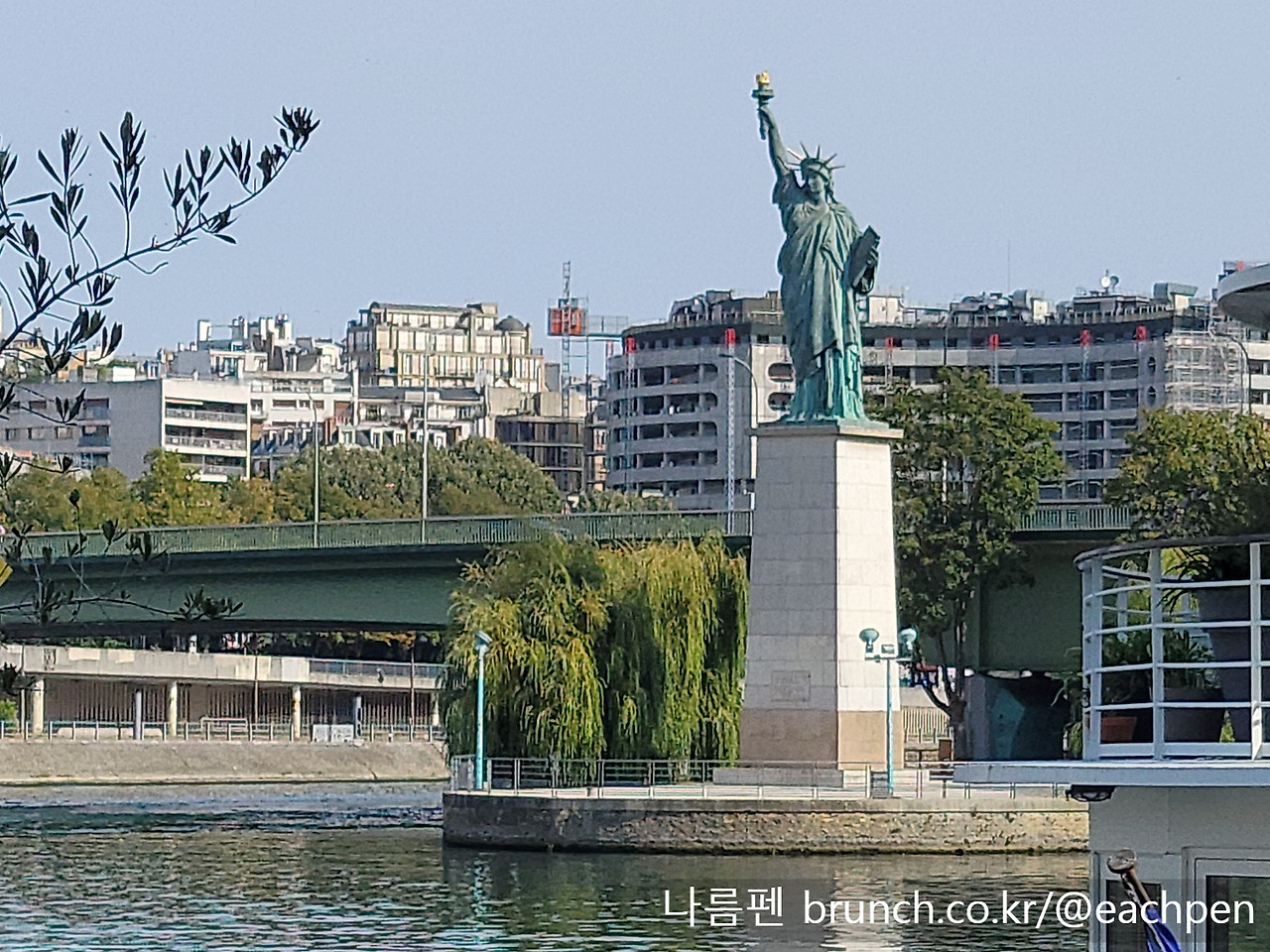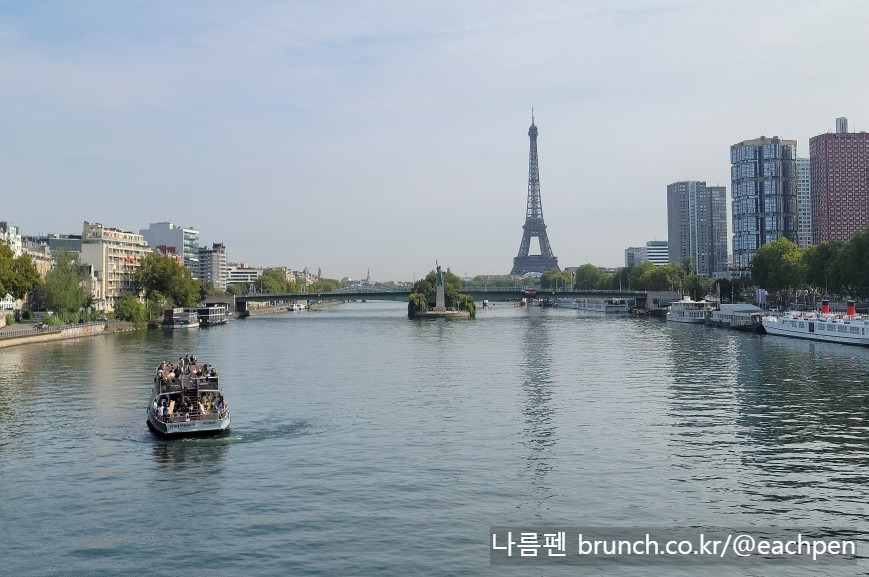 다리 위로 오르니, 강 위 저만치 시뉴섬(L’Île aux Cygnes)이 떠받치고 있는 그르넬 다리와 자유의 여신상 그리고 먼 곳의 에펠탑까지 한눈에 이어져 보였다. 순간 오래 전의 파리가 숨결처럼 되살아났다.