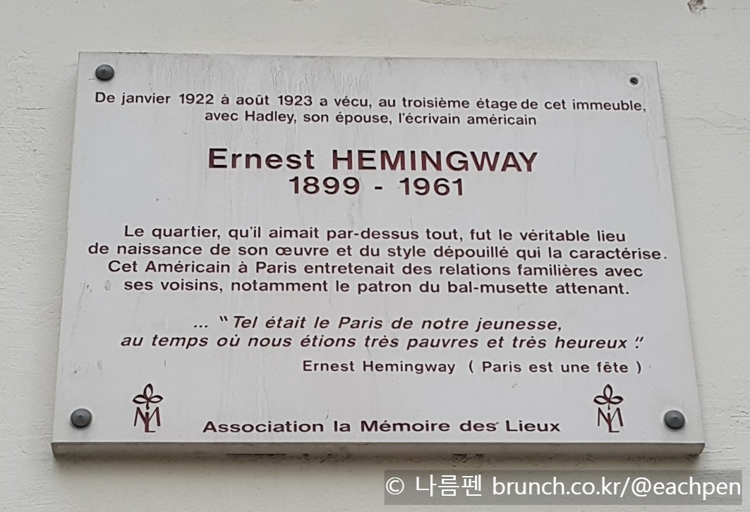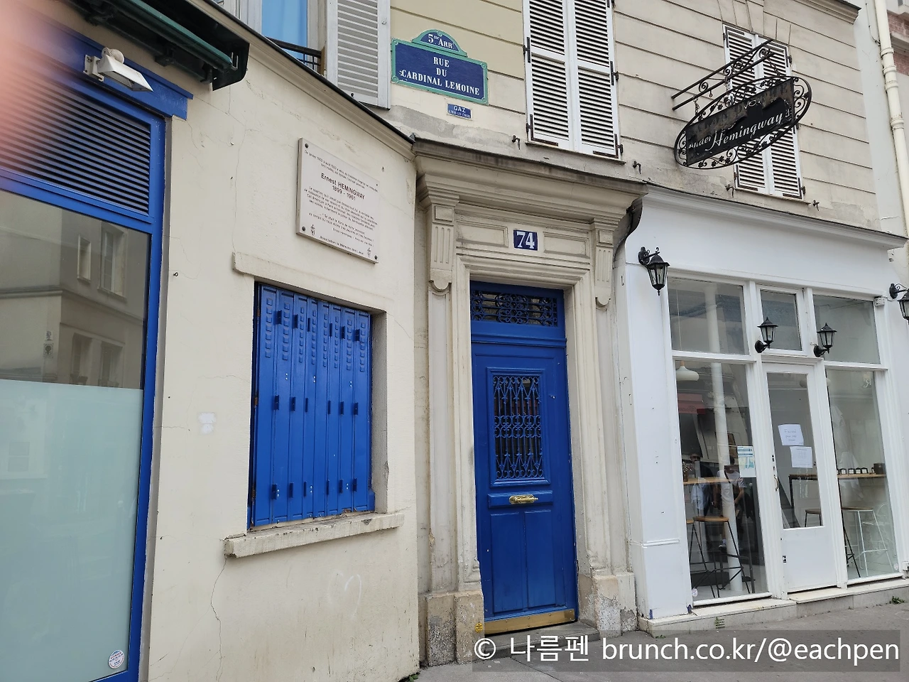 청년 헤밍웨이의 하루는 까르디날 르무완 길(Rue du Cardinal Lemoine) 74번지에서 시작된다. 그는 부인 해들리(Hadley)와 결혼한 지 삼 개월 남짓 지난 1921년 12월 하순의 어느 겨울날, 파리에 처음 도착했다. 미국에서 시작된 신혼생활을 이제 타국의 추위 속에서 이어가고 있었다. 이때는 가난과 낯섦 때문에 더욱 추웠을지도 모를 시작의 계절이지만, 사랑과 희망 그리고 소설가가 되겠다는 열정으로 더없이 행복한 시기다. 그는 이곳에서 1922년 1월부터 첫아들 범비(Bumby)가 태어나기 전인 1923년 8월까지 머물며, 재능을 키워가는 배움의 시간을 보낸다.
