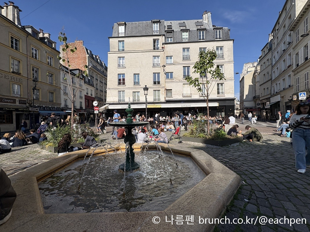분수를 중심으로 이루어진 원형의 광장은 크지 않지만, 네 개의 길과 맞닿으며 다섯 갈래로 열려 있다. 이 동네의 먹거리 골목인 오래된 무프타르 길이 광장의 가장자리를 따라 지나가며, 하나의 방향을 더 보태 다섯 갈래로 흩어진다.