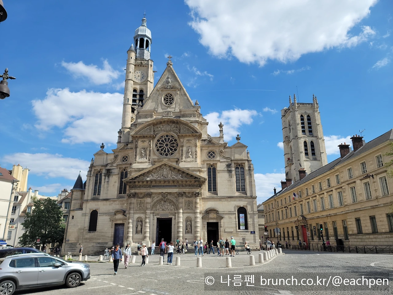 그는 팡테옹 광장 뒤편에 인접해 있는 오래된 생테티엔느뒤몽 성당(Eglise Saint-Etienne-du-Mont)을 향해 걷는다. 고딕과 르네상스 양식이 겹쳐진 이 성당은 조용하면서도 구조적인 아름다움을 지닌 장소다. 그에게 이곳은 신앙의 공간이라기보다, 침묵 속에서 내적 질서를 가다듬는 정신적 피난처다. 돌의 구조와 고요함은 문장의 군더더기를 덜어내는 데 도움을 준다. 훗날 영화 《미드나잇 인 파리》(Midnight in Paris)가 이 주변을 '시간의 문'처럼 사용한 것도 우연은 아니다. 이 길은 언제나 말보다 먼저 절제를 가르친다.