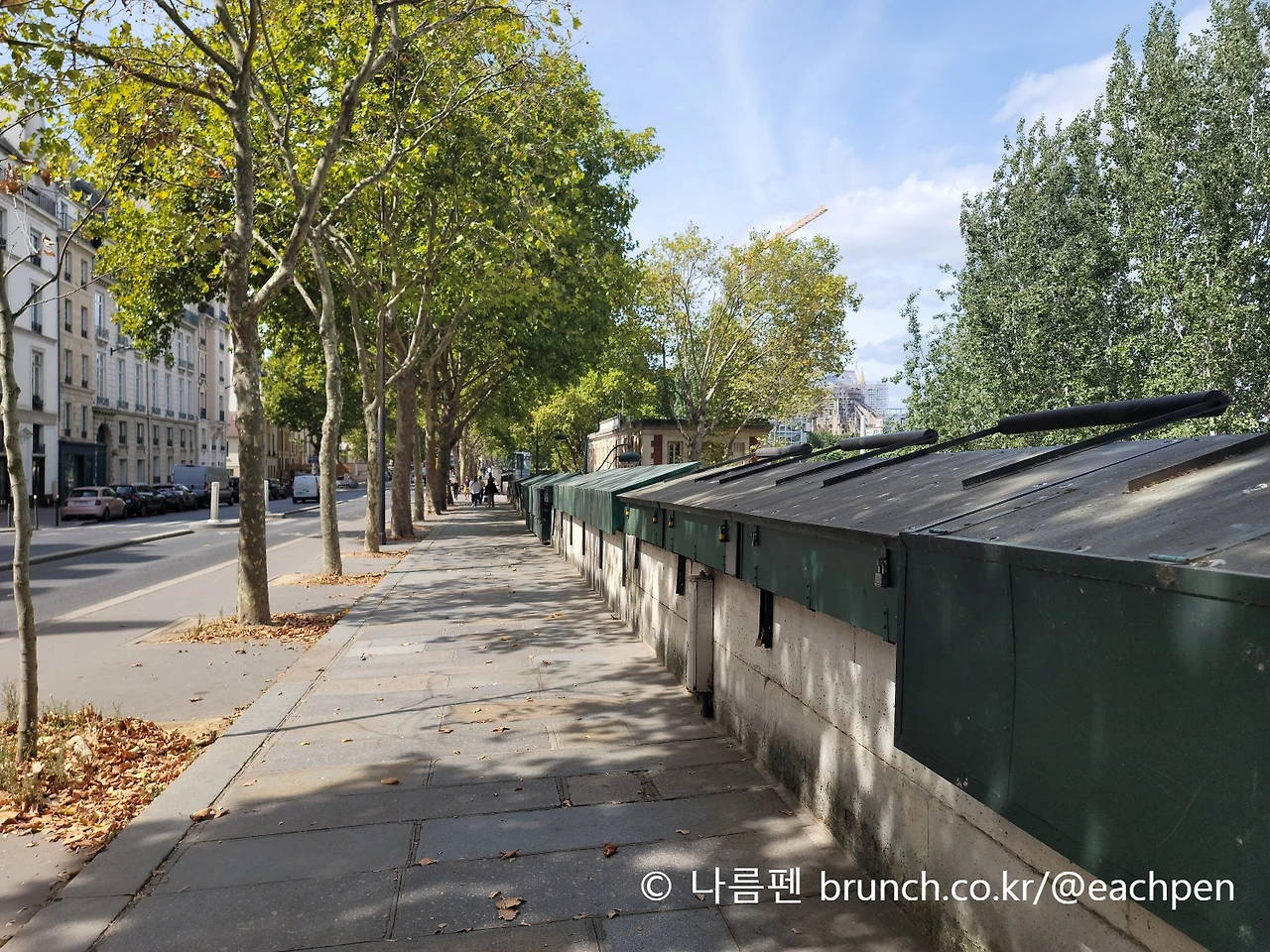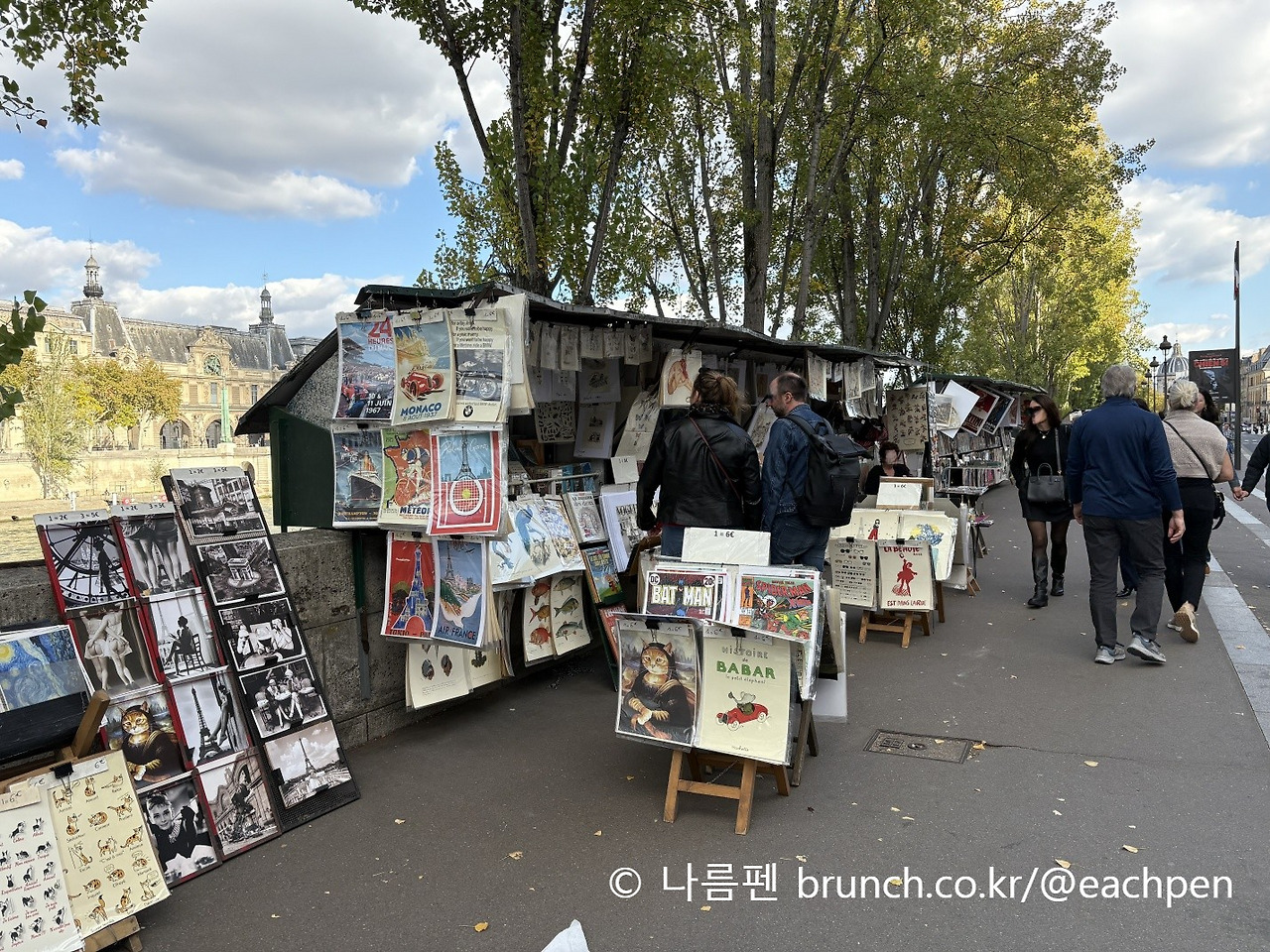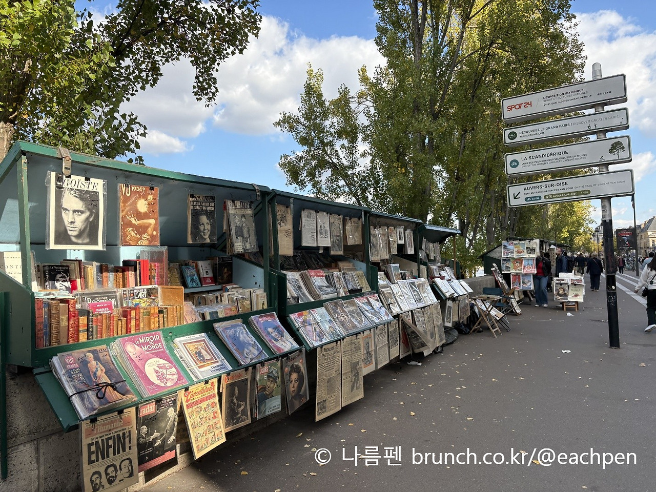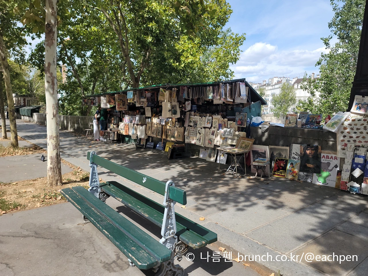 도심의 센강 석축 제방을 따라 걷다 보면, 짙은 녹색 철제 상자들이 돌난간에 고정된 채 길게 늘어선 풍경과 마주한다. 사람들은 이를 강변의 노천서점이나 노천헌책방이라고 부르는데, 프랑스어로는 '센강의 부키니스트'(Les Bouquinistes de la Seine)라고 한다. 고서적과 헌책, 판화와 그림, 엽서, 빈티지 잡지와 오래된 포스터까지, 부키니스트는 강변 난간 위에서 시간을 펼쳐 놓는다. 길이 2미터 남짓의 상자들이 양쪽 강변을 따라 약 3킬로미터에 걸쳐 늘어서 있어, 단순한 가판대가 아니라 세월을 담는 작은 서랍처럼 보인다.