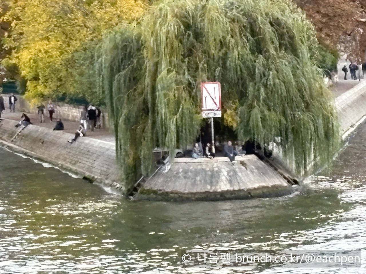 그 비좁은 공간은 젊은이들의 조용한 낭만의 장소가 되어 있다. 그 가지는 울음이 아니라, 연인과 친구들이 이곳에 앉아 남기고 간 고요에 가깝다. 강물 위로 흘러내리는 것은 슬픔이 아니라 침묵이다. 물기 어린 땅에 뿌리를 두고 자라는 수양버들처럼, 사람도 각자의 자리에서 삶을 틔운다.