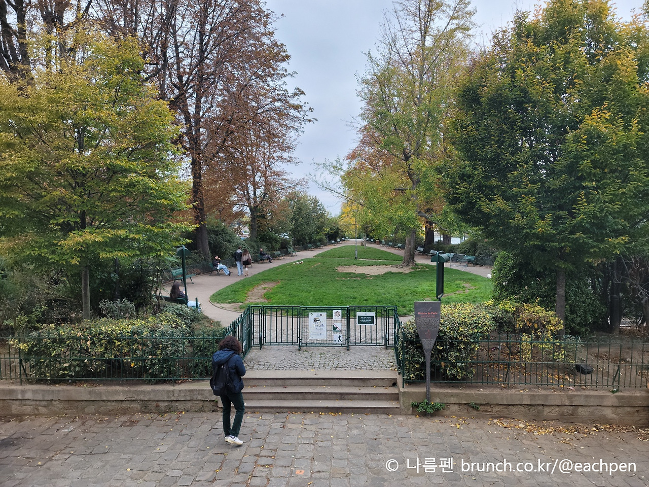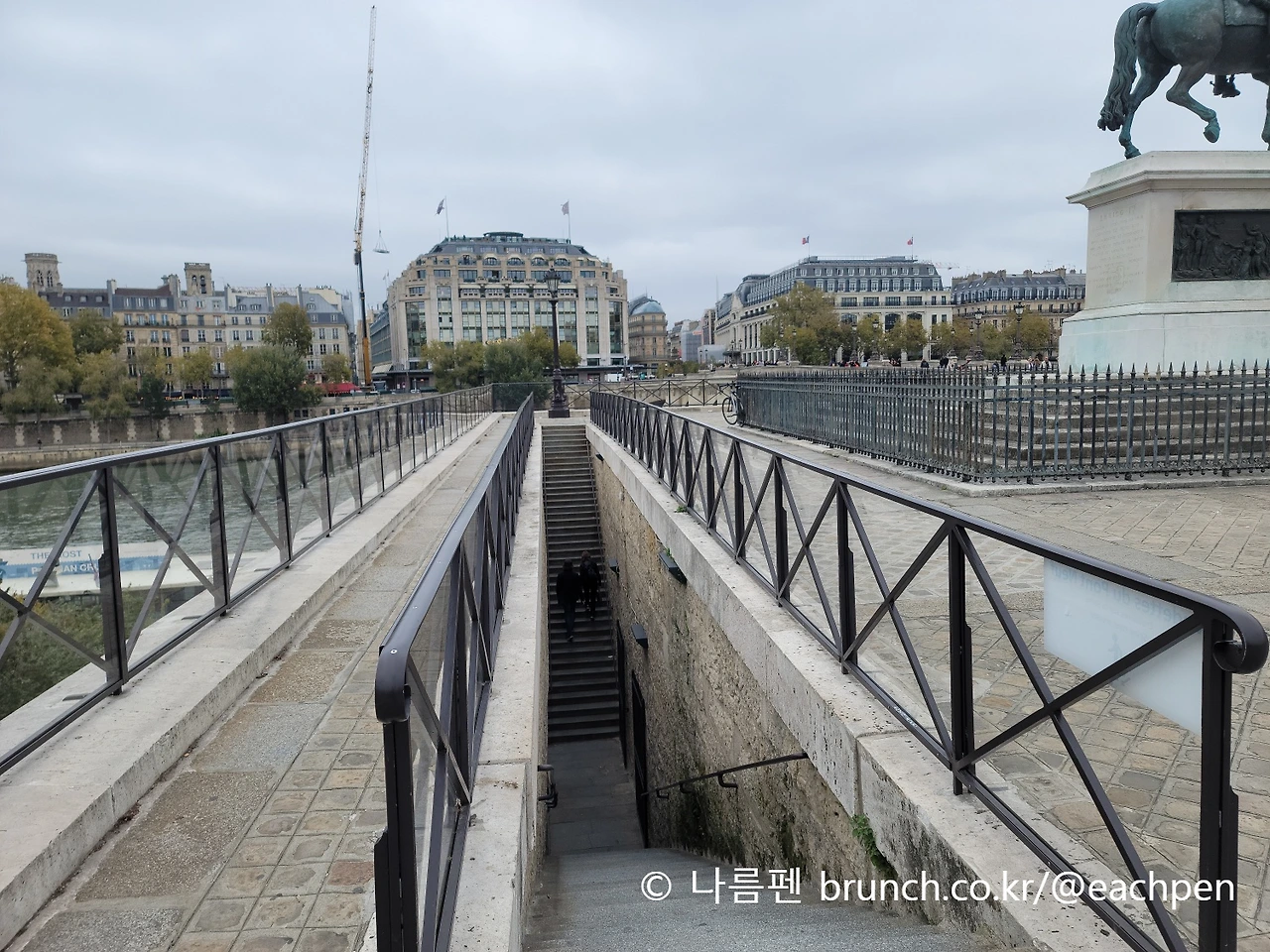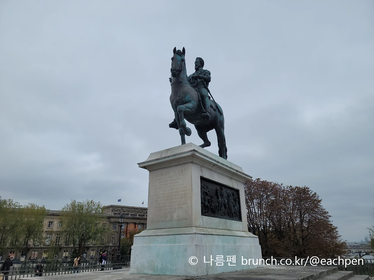 퐁뇌프 중간쯤, 시테섬과 연결되는 지점에는 완공 당시의 프랑스 왕 앙리 4세의 기마상이 오롯이 서 있다. 이 동상 뒤편의 좁은 계단을 따라 내려가면, 시테섬 서편 끝자락의 작은 공원에 닿는다. 강 하류를 향해 뾰족한 뱃머리처럼 나아간 삼각형 공간, '베르갈랑 공원'(Square du Vert-Galant)이다. '베르갈랑'은 '늙어서도 정열을 잃지 않은 왕'이라는 앙리 4세의 별명에서 유래했다. 사람은 사라지고, 별명은 지명이 된다. 이것 또한 시간의 방식이다.