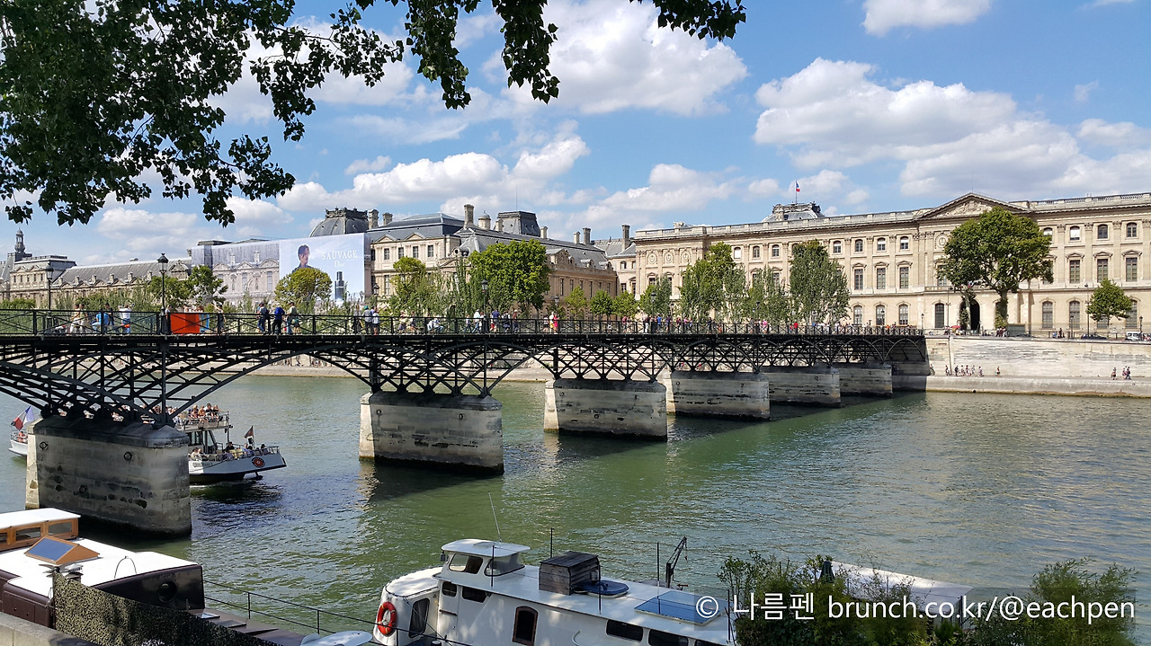 파리 센강(la Seine) 위엔 37개의 다리가 있다고 알려져 있다. 이 중 내게 특히 정감을 느끼게 하는 다리가 차 없는 보행자 전용 다리인 ‘뽕데자흐(Pont des Arts)’, 이른바 '예술의 다리'다. 그 다리 위론 행인, 관광객, 연인들, 길거리 연주나 공연 등으로 붐비기도 한다. 제법 오래전 파리 여행방문 때 이 ‘예술의 다리’를 건너 '루브르 박물관' 쪽으로 가는 길이었다. 그런데 '예술의 다리' 난간에도 사랑의 자물쇠가 빼곡했다. 예전 파리 유학 시절 당시에는 전혀 없었던 사랑의 자물쇠가 예술의 다리 난간을 점령한 사실에 자못 놀랬었다.
