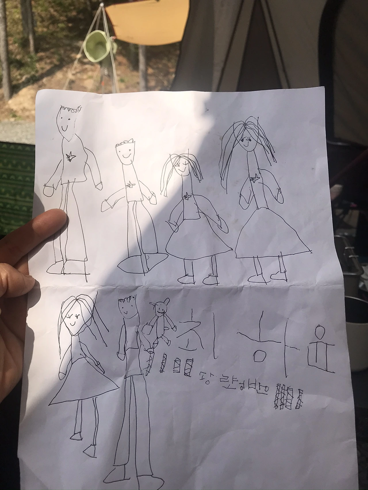 두 아이는 미술을 좋아한다. 종이 한 장에 볼펜으로 캠핑에서 끄적이던 그림 한 장.