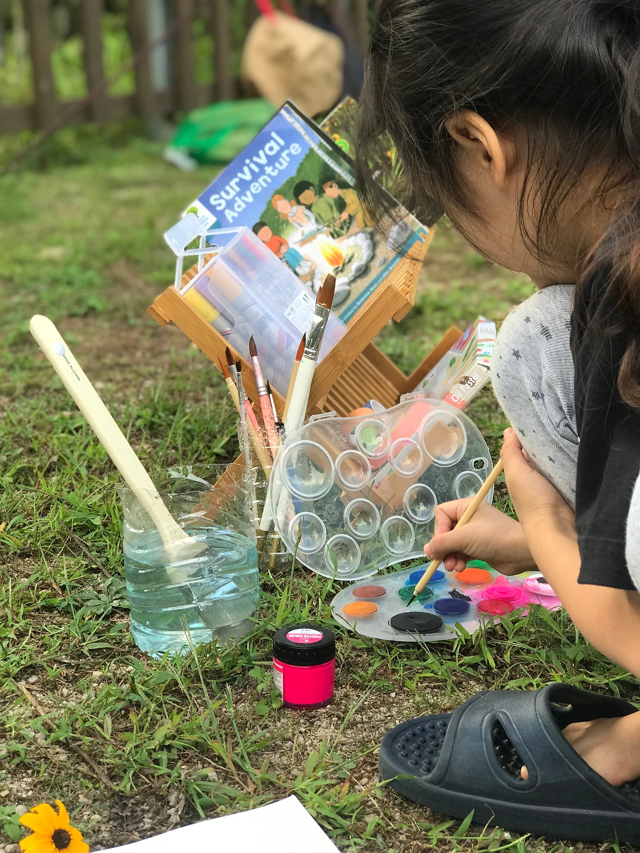 사용이 손쉬운 고체 물감, 붓 몇 개, 종이 몇 장이면 된다. 색다른 미술 표현이 필요하다면 마스킹 테이프를 추천한다. 밋밋한 그림을 색다르게 표현할 수 있다. 캠핑 때 항상 나타나는 일회용 물병은 물통과 붓통으로 사용하면 된다.