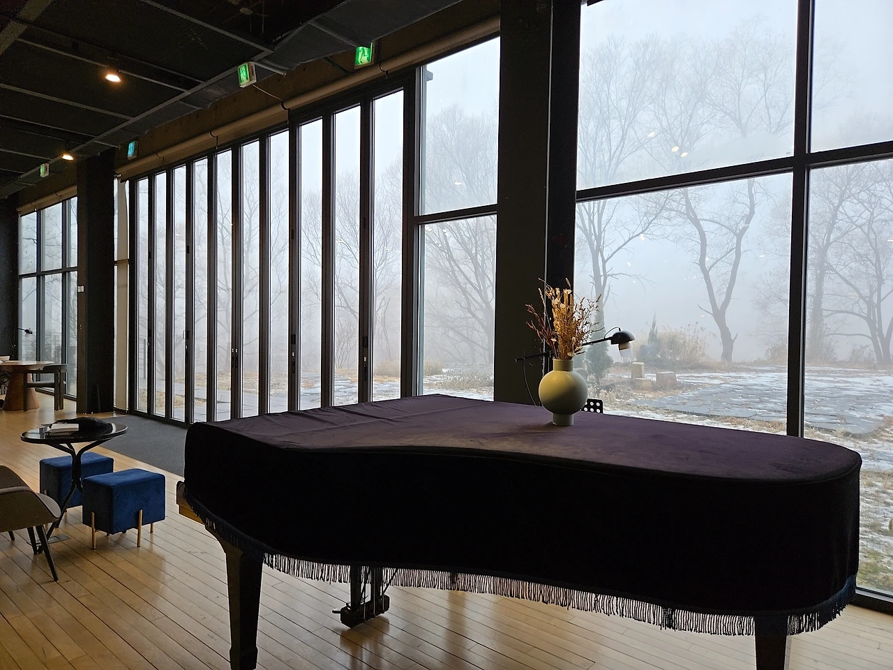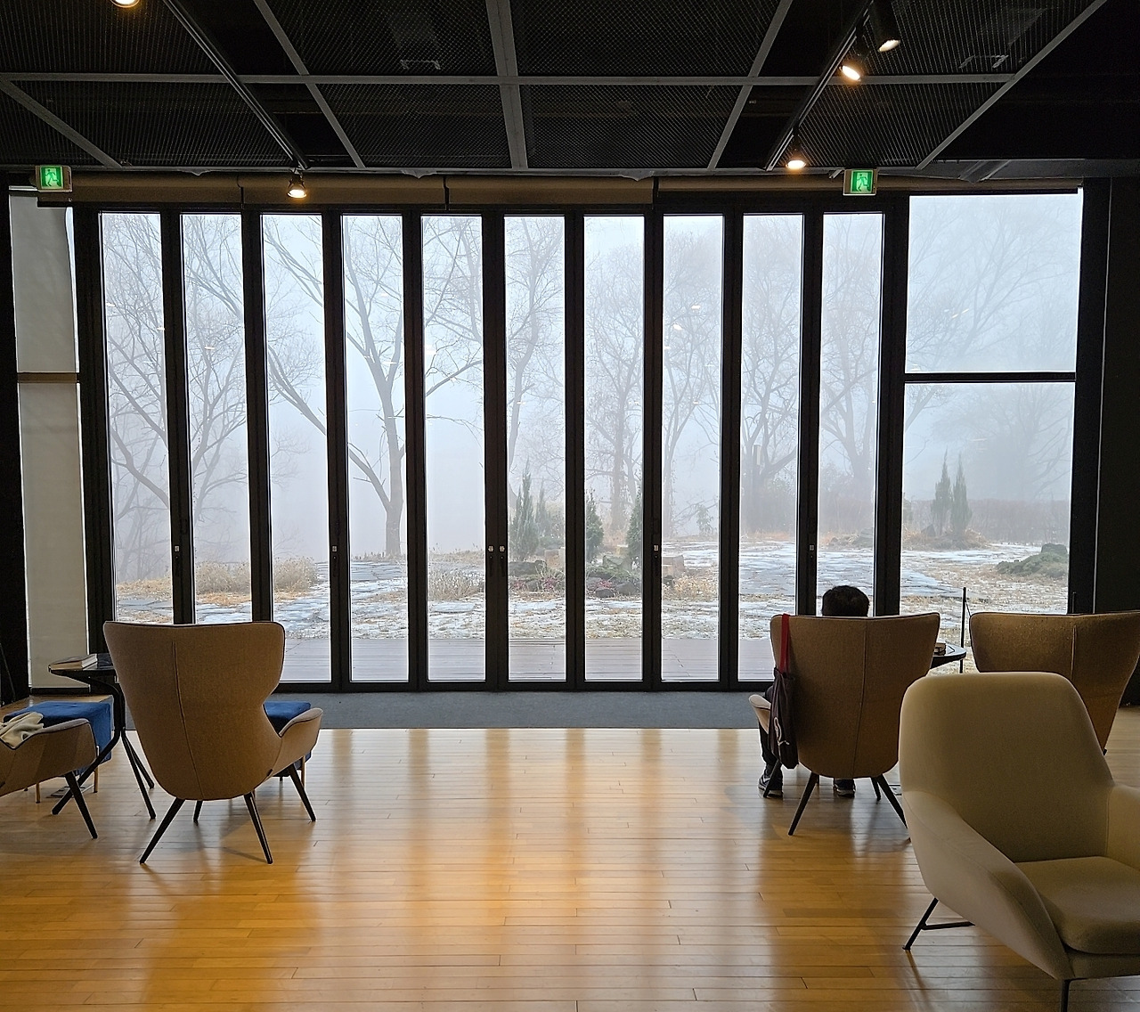 커다란 창문을 통해 저 멀리 겨울 풍경이 보인다.