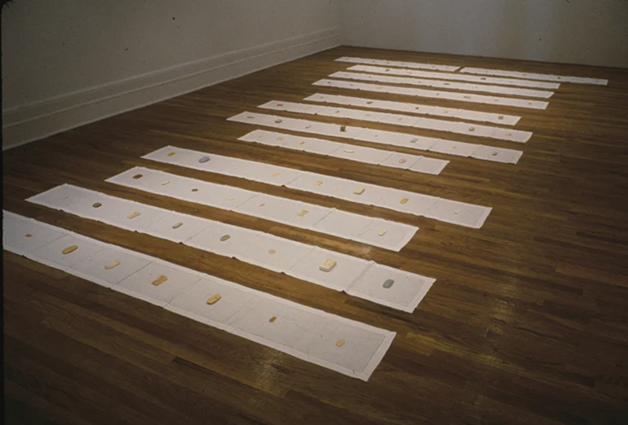 1989년부터 공중 화장실 비누를 훔치기 시작했다고 고백한 작가는 1991년 자신의 개인전 전시장 바닥에 훔친 여러 개의 비누들을 흰 리넨 천 위에 나란히 놓아둡니다. 이 몰래 가져온 비누들은 익명의 손들과 옅은 물의 압력에 의해 마모된 작고 알록달록한 조각품으로 변모해 전시실에 전시됩니다.