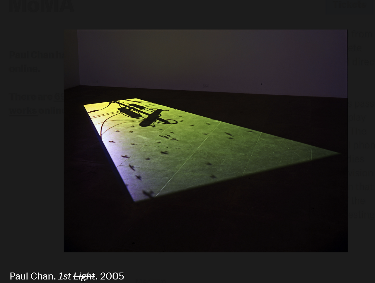 동시대 예술가 폴 찬(Paul Chan)도 2005년 발표한 고요한 영상 작품도 이런 방식으로 사람들에게 잊지 못할 장면을 만들었습니다. 그림자로 이루어진 이 애니메이션은 흩날리는 나뭇잎, 노을로 핑크빛으로 물든 아름다운 하늘 배경으로, 천천히 하늘로 부유하는 일상적 물건들, 자전거, 스마트 폰, 건물들을 보여주다가 갑작스레 하늘에서 사람이 떨어지는 모습을 마주하게 합니다.