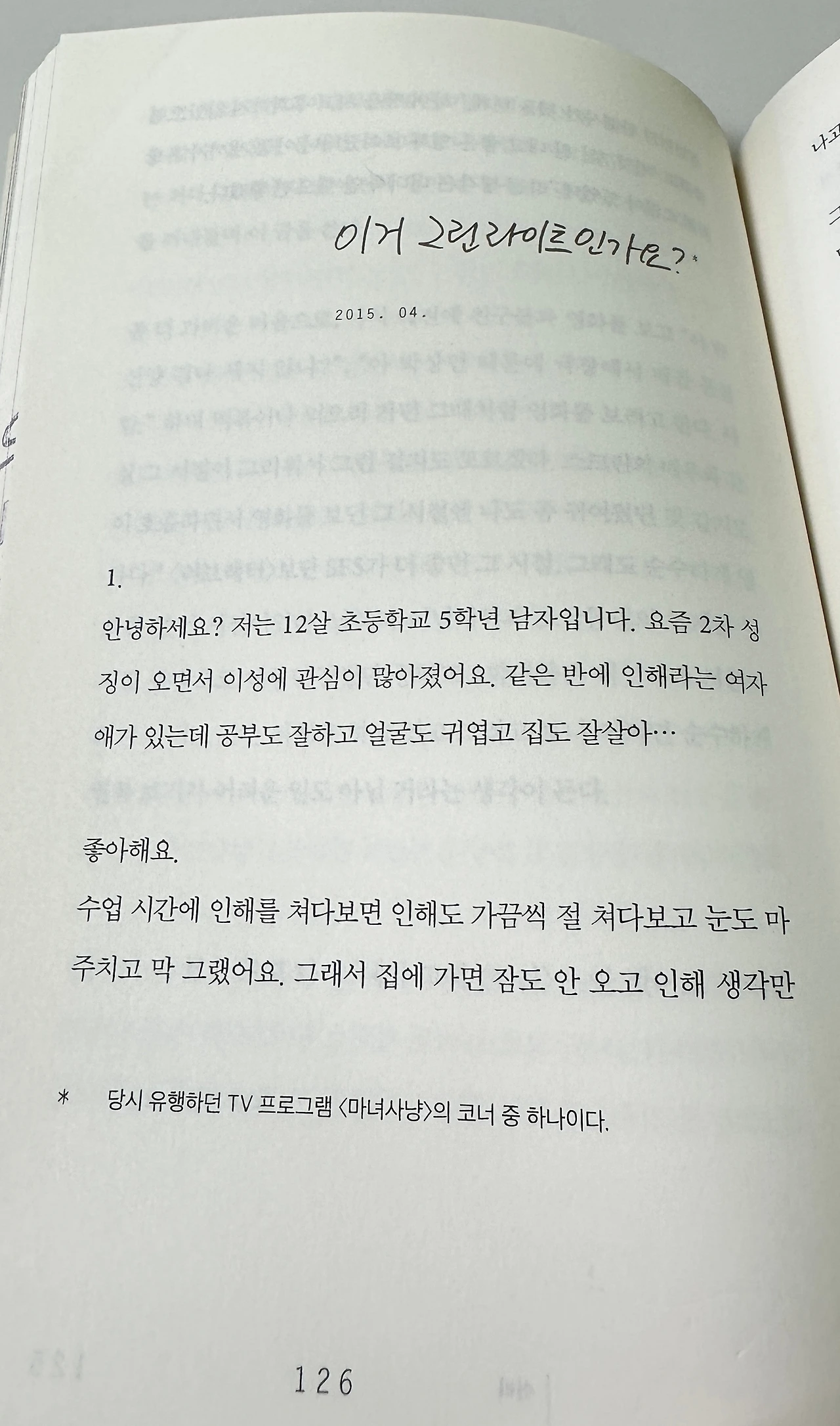 한 열흘? 전부터 모르는 여학생이 제 옆자리에 앉아요. 처음엔 자리가 없으니까 앉는 거겠지 했어요. 근데 비어있는 자리가 많은데도 불구하고 제 옆자리를 고집하는 거 있죠. 눈여겨봤어요. 상업고 학생이네요. 명찰 색깔을 보니 저랑 동갑이고요. 네. 좋아해요.