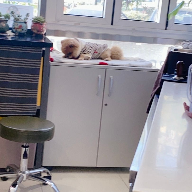 지팡이를 가지런히 세워놓고 초코라테를 기다리고 있다. 휠체어의 시선에서는 보기 힘들었던 포리(카페 매니저님 강아지)가, 우뚝 서있는 상태에서의 시선에는 아주 잘 보여 괜스레 기분이 좋아지고 있다.