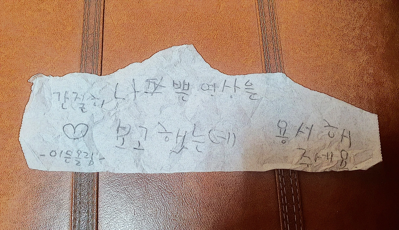 아이가 하도 무서운 영상을 본 생각이 수시로 떠오른다고 얘기하길래 무심코 종이에 무서운 걸 쓰고 구겨서 던져보자고 했는데 아이는 이미 내가 양치를 하는 동안 종이에 뭔가를 쓰고 있었다.