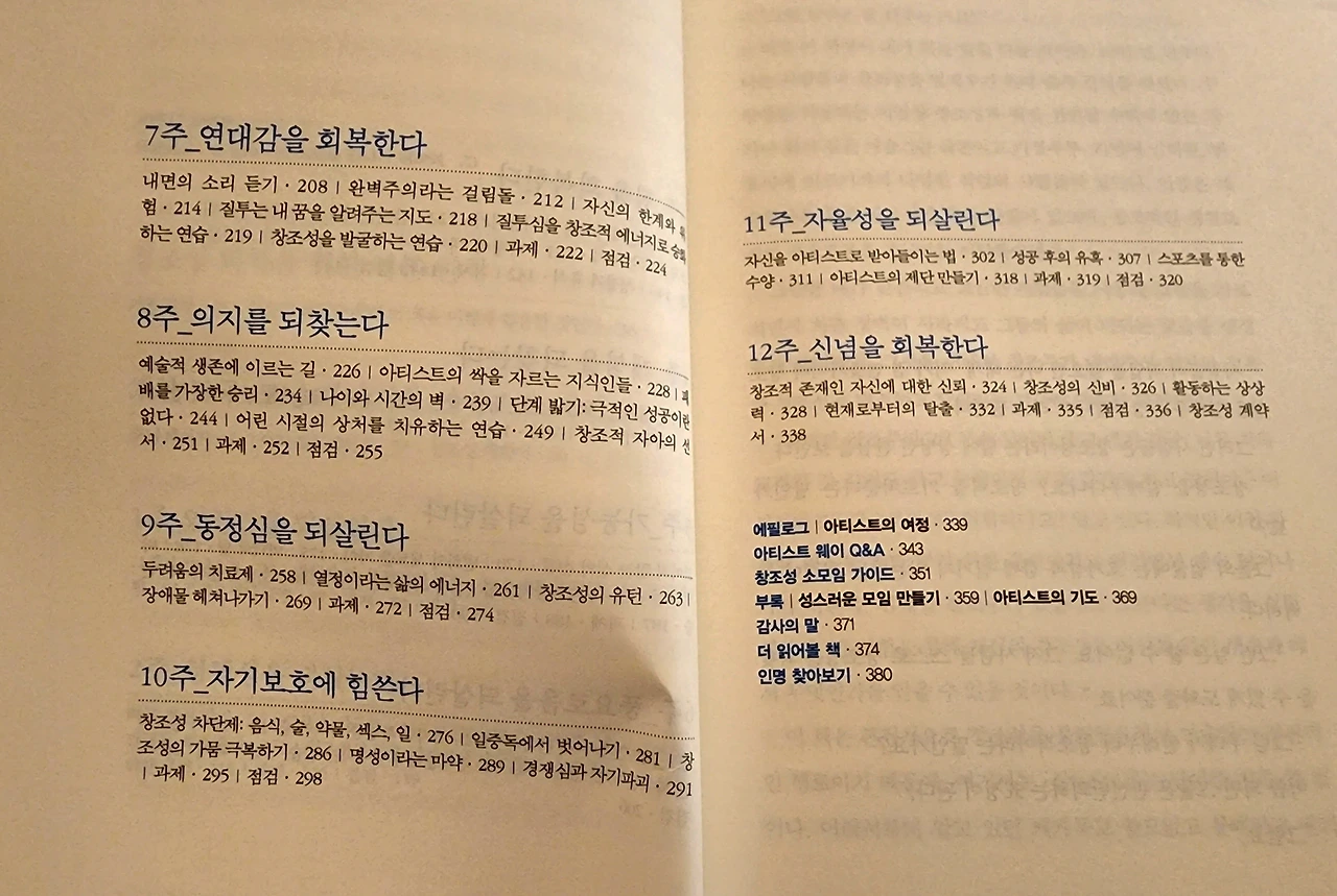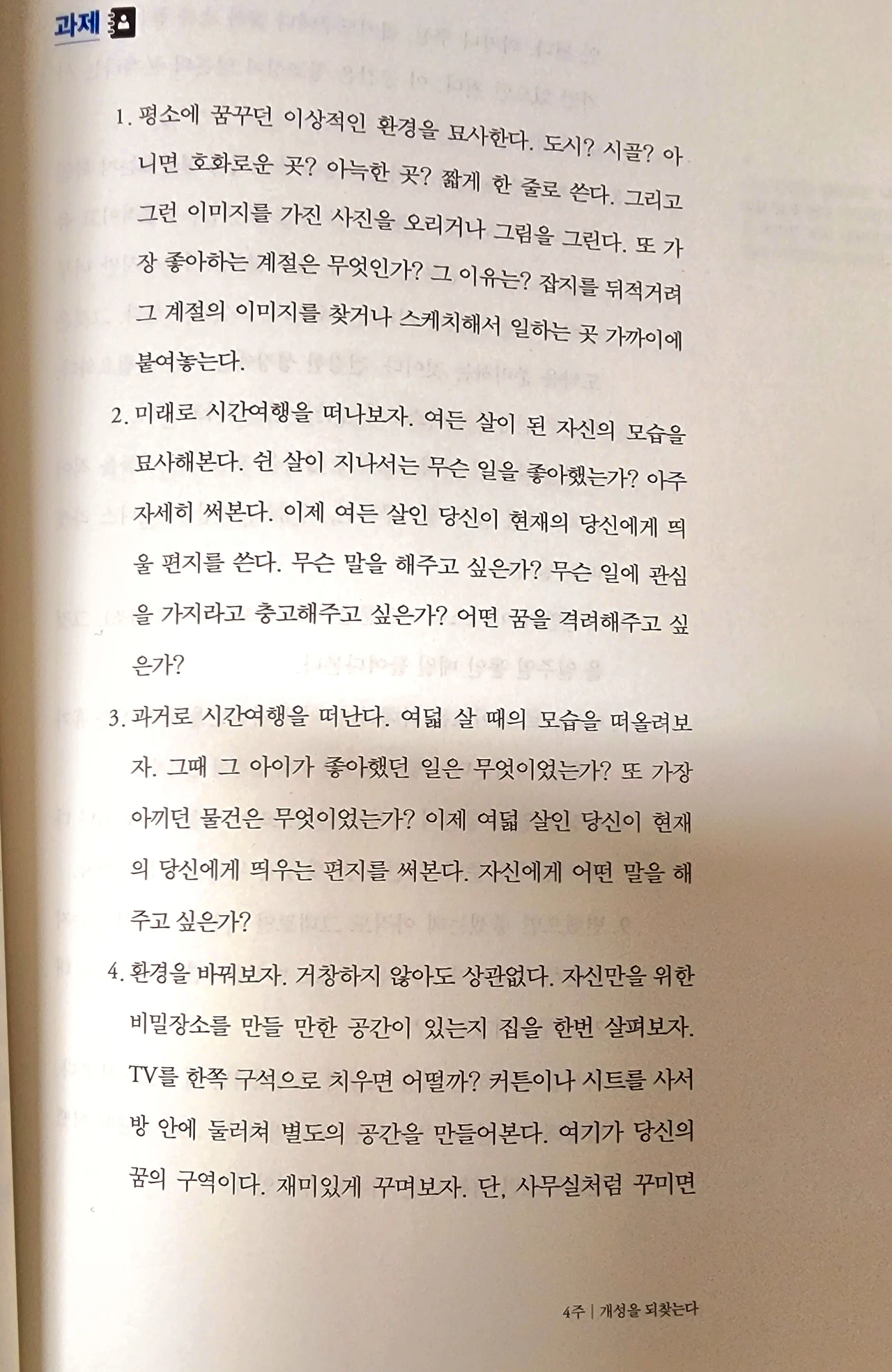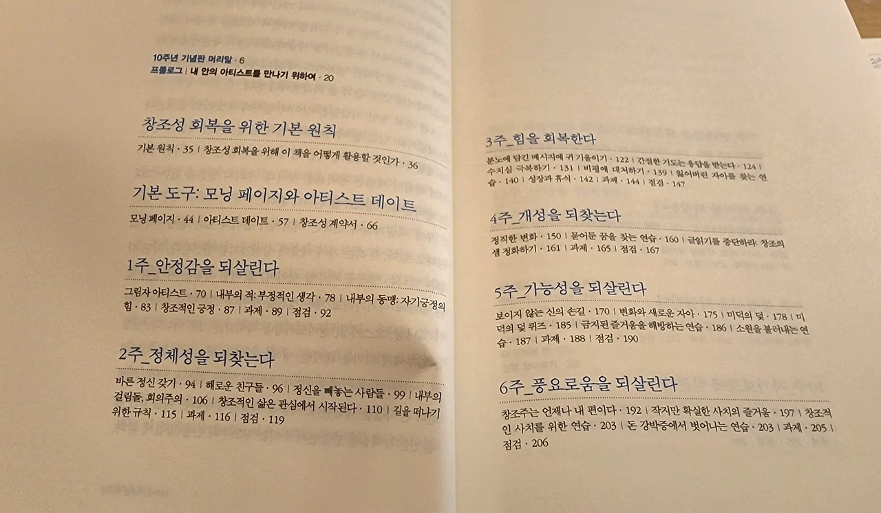 책을 보면 총 12주 차의 주제와 과제가 나온다. 각 주차의 과제는 이것저것 해야 할 게 꽤나 많다. 어느 정도 마음을 먹고 해야 한다. 매주 차의 기본 과제는 모닝페이지와 아티스트웨이 이고 그밖에 매번 다른 8~10개의 쓰기 과제가 있다. 책을 일단 일독했으니 이제 1주차부터 과제를 차근차근 해보려한다.
