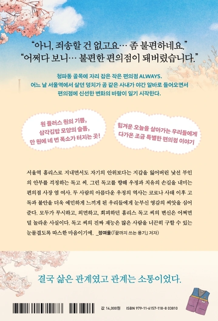 요식업으로 일가를 이룬 부모님 아래서 자란 시현이 귀가 따갑게 들은 말이다. 가게도 결국 사람 장사다. 손님을 귀하게 대하지 않는 가게와 직원을 귀하게 대하지 않는 사장은 같은 결과를 얻게 된다. 망한다는 말이다. 그런 의미에서 청파동 이 편의점은 적어도 망하지는 않을 것이다. (53)