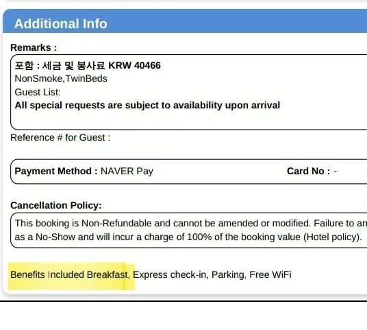 아내는 분명히 조식이 포함되었다고 하면서 아고다에서 영문확인서를 받아 다시 보내주었다. 자, 이제 영어로 확실히 'Breakfast'라고 쓰여 있으니 더 이상 할 말이 없겠지. 그러나 직원은 고개를 갸우뚱하며 다시 설명한다.