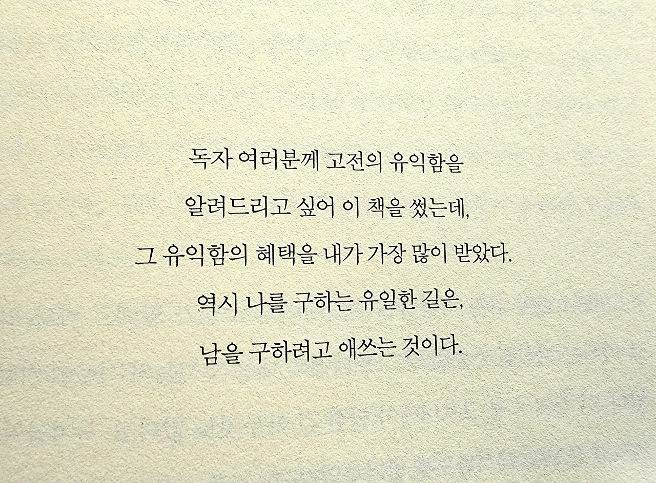 고전은 모양이 없다. 나는 모양이 있다. 내가 고전을 읽으면 고전이 내 모양으로 바뀐다. 그 고전은 세상과 싸울 어떤 무기보다 단단한 갑옷이 된다. 6p