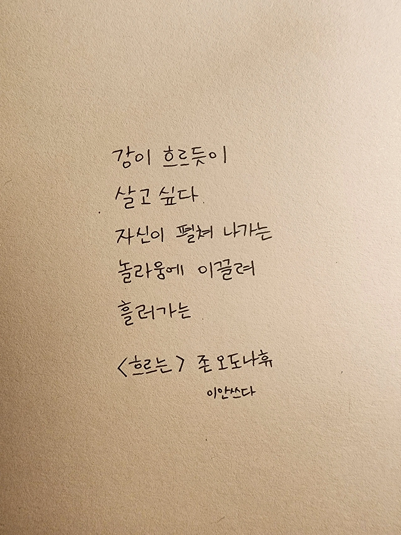 자신이 펼쳐나가는 성실함과 놀라움에 이끌려, 나도 모르게 점점 거대한 물줄기를 만들어내는 강처럼, 나도 그렇게 하루하루를 살아내고 싶다. 너른 궤적을 그리며 굽이굽이 흐르는 강의 이미지, 그 심상을 마음에 품고, 오늘의 하루를 시작한다.