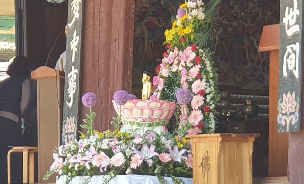 오늘 가장 신기했던 순서였다. 일단 금색으로 된 작은 아기부처님 모형이 상단 중앙에 있던 것도 처음 보는 것이라 신기했다. 그런데 이 '관불의식'때는 사람들이 차례대로 이 아기부처님 모형 위에 작은 바가지로 물을 부었다.