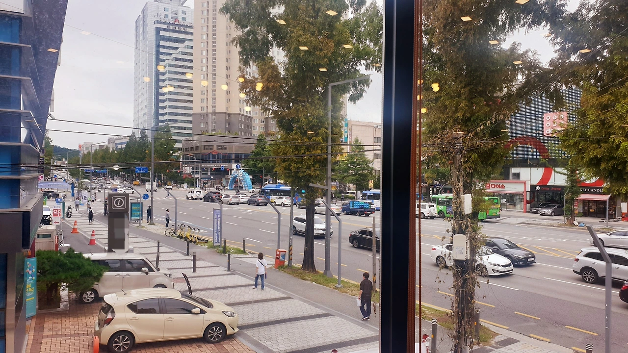 오늘은 휴무일이다. 통유리 덕에 거리가 잘 내려다 보이는 곳에 앉아 지나가는 사람들과 차를 멍하니 내려다본다. 들려오는 음악이 조금 요란스럽긴 하지만 그래도 밖의 풍경들이 시원하게 보이고 의자도 나름 편안해 좀 더 머물고 있다.
