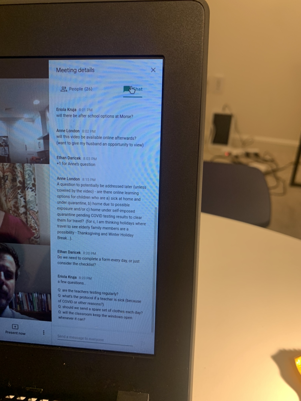 학교 문을 열기 며칠 전 저녁 7시반에 학교와 학부모들간 온라인 미팅이 있었다. 늦은 저녁시간이었는데도 학교장과 담임교사, 보건교사, 각 분야 학교스탭들까지 모두 참여한 토론이었다. 모두가 학교 오픈을 앞두고 긴장한 모습이 역력했다.