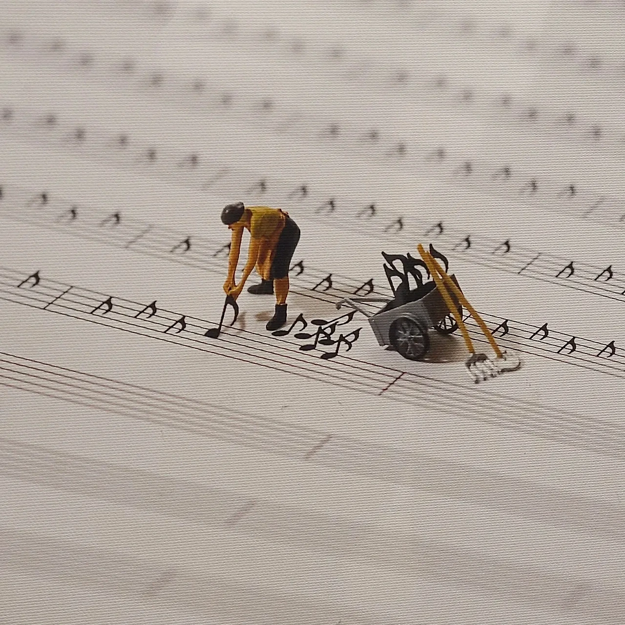 작가의 발상도 신선했지만 각 작품에 붙인 제목을 보고 더 많이 놀랐다. 단순히 '귀엽다'에서 끝나는 게 아니라, 여기서 이런 언어유희를 한다고? 이게 이런 뜻을 내포하고 있다고? 싶었던 순간이 계속되었다. 그야말로 '와우 포인트'의 향연인 것이다. 대표적으로, 높은 음자리표를 악기 삼아 연주하는 작품의 제목은 I can't do it alone(=나 혼자서는 아무것도 할 수 없어). 즉, 높은 음자리표만으로는 음악이 연주될 수 없다는 뜻이다. 이처럼 자그마한 미니어처에 우리의 거대한 세상을 담아냈기에 사람들이 절로 고개를 끄덕이게 만드는 것이다.