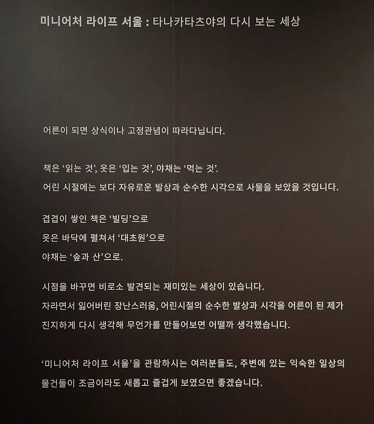 카피라이팅에 관심이 많다 보니 지나치는 짧은 순간에 시선을 붙들거나 곰곰이 생각하게 만드는 문장을 보면 희열을 느낀다. 미니어처 라이프 서울전에서는 이러한 희열이 몇 걸음 간격으로 꾸준히 반복되었다.