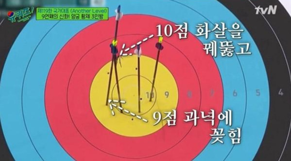 김제덕 선수가 먼저 10점 화살을 쐈고, 뒤이어 안산 선수가 쏜 화살이 김제덕 선수의 화살을 뚫고 9점 과녁에 꽂혔습니다. 이를 두고 '로빈후드 화살(애로우)'라고 부르는데, 통상적으로는 화살을 꿰뚫기 때문에 앞 화살과 동일 점수가 된다고 합니다. 훗날 한 프로그램 인터뷰에 따르면 안산 선수의 목표 중 하나가 중계 화면에 이 로빈후드 화살을 만들어 보는 것이었다고 합니다. 이제 그 꿈을 이뤘다고 말하는 선수의 모습이 정말 멋지고 대단하다고 생각했죠.