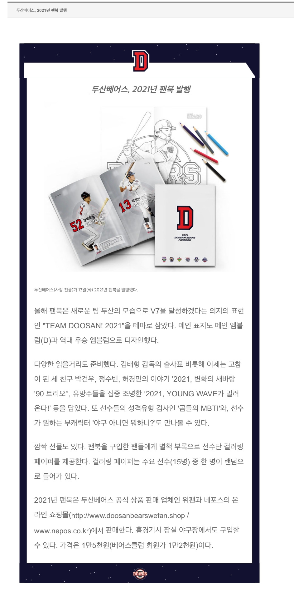 며칠 뒤, 프런트분들과 팬북 미팅을 하기 위해 팀장님과 함께 잠실 종합운동장으로 갔다. 야구장 자체도 안 가봤던 당시 구장 내부에 두산 베어스 로고가 큼지막하게 박힌 사무실을 보자 가슴이 두근두근 세차게 뛰었다. 프런트 직원분들과 첫인사를 나눈 후 바로 기획서를 보여드렸다. 최대한 야구라는 종목과 두산 베어스라는 구단에 익숙해지기 위해 많이 노력했는데, 기획이 괜찮을지 걱정이 되었다. 얼마의 시간이 흘렀을까. 프런트분들 중 엄마 곰이라고 불리는 푸근한 인상의 리액션이 좋으신 과장님께서 이런 말을 하셨다.