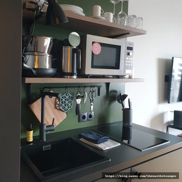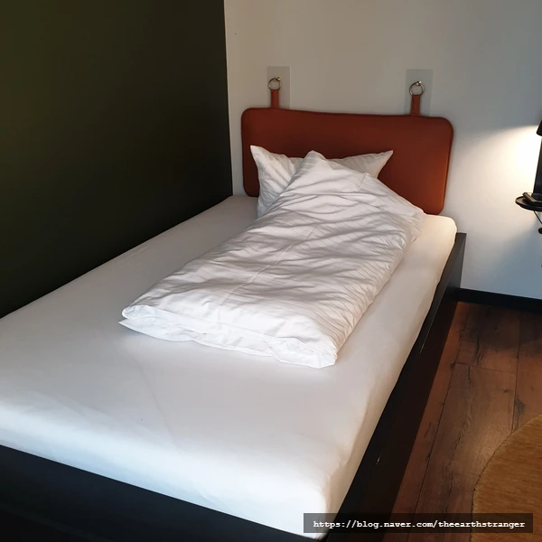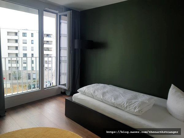 내가 예약한 객실은 1인용 객실로 작은 부엌과 개인 욕실에 딸려있고 싱글 배드가 있는 방이다. 주방은 작지만 있을 건 다 있는 알찬 구성! 긴 주말여행으로 4일간 머무르기에는 무리가 없어 보인다. 간단한 요리가 가능하고 작은 냉장고도 있고, 캡슐 커피 머신도 있어서 머무르는 동안 커피나 차 등도 편하게 마셨다. 욕실과 침구도 완전 깔끔깔끔! 정말 역대급으로 마음에 드는 인테리어와 청결함!