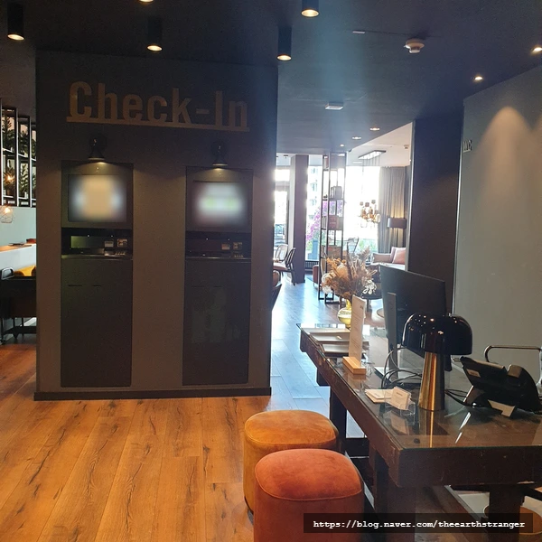 1층에 도착하니 데스크에 직원이 있긴 하나! 체크인은 기계로 하라고 친절하게 알려준다. 하하. 체크인 기계로 개인정보 등을 입력하면 기계에서 방 번호가 적힌 영수증과 객실 카드가 나온다. 1층에는 작은 인포데스크와 자판기, 그리고 공용 휴식 라운지가 있고, 밖에도 벤치 등 앉을 수 있는 공간이 있었다.