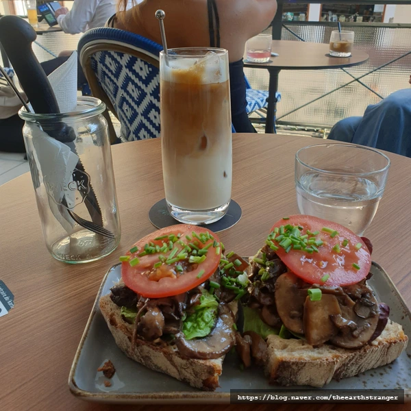 길을 걷다가, 커피 덕후인 나는 미리 봐두었던 카페들 중 한 곳을 우연히 발견! 늦은 점심 겸 저녁을 먹기 위해 카페 안으로 향했다. 실내 인테리어는 꼭 바 같았는데, 뒤쪽으로 가니 작게 흐르는 수로 옆으로 발코니가 있어 아기자기한 풍경을 보며 음식과 커피를 즐길 수 있었다. 원래 독일에서 아이스커피 잘 안 마시는데, 이 날은 너무 더워서 안 마실 수가 없었...