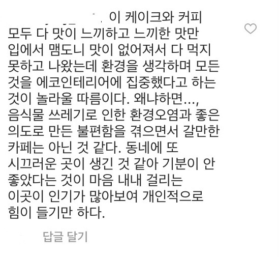 지구를 생각한다는 ㅇㅅㅇㅅ라는 연남동 카페인데, 케이크를 포장하려면 다회용기를 사 오라고 하더라. 그게 더 큰 쓰레기를 만드는 거 아닌가?라는 글에 꽤 많은 댓글로, 내 친구도 거기서 포장하려고 다이소에서 그릇 사감 ㅋㄷ 친환경 콘셉트임, 덜 직설적으로 담아보긴 했지만 대략 이런 류의 댓글이 달려 가게를 애정하는 손님들이 하나둘씩 나에게 그 커뮤니티 사이트를 알려주셨다.