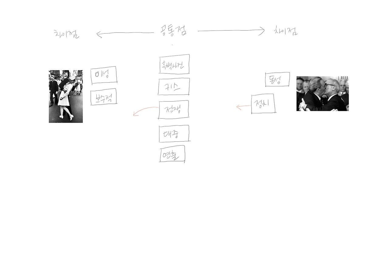 이 글에서는 두 개의 그림을 가지고 연관성을 찾아낼 수 있는 감상법을 소개한다. 아래의 예는 실제로 튜토리움시간에 학생들에게 주어졌던 사진이다. 주어진 사진은 2차 세계대전이 끝난 후 귀국한 병사가 길거리의 여자를 붙잡고 기습 키스를 했다는 내용으로 유명한 사진이다. 오른쪽은 '형제의 키스'라고 알려져 있는 동독과 소련의 정치인 사이의 키스다. 학생들은 손바닥만 한 종이에 이 그림에 대한 자신이 생각하는 키워드를 적어낸다. 두 그림(사진)을 양 옆으로 멀찍이 떨어뜨린 뒤에 두 그림의 공통점에 해당하는 것은 맨 가운데에, 차이점에 해당하는 것은 각 속성이 어울리는 그림 옆에 매치하도록 한다. 아래의 박스 안의 키워드들은 실제로 학생들이 적어 낸 단어들이다.
