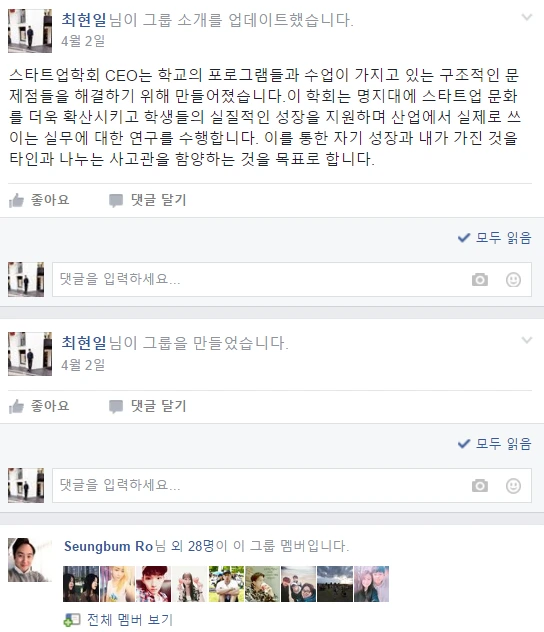2016년 3월에는, 학교 과 선배와 학교 교육에 대한 문제점을 얘기나누고, 학생들의 잠재력이 발휘되지 못하는 점들을 얘기나누다가 , 이런 것들을 해결해줄 수 있는 학회가 있어야된다는 것에 목소리를 모았고, 그렇게 해서 스타트업을 연구하고 지식을 공유하고 실질적 경험을 해보는 CEO학회가 창립,첫 운영되었습니다.명지대에서는 스타트업(스타트업 바람을 넣는..ㅎㅎ?)이라는 조직을 만들고 활동을 하는 건 최초였습니다.저희는 매주 화요일 8시에 강의실에 모여 연구를 진행하였습니다.