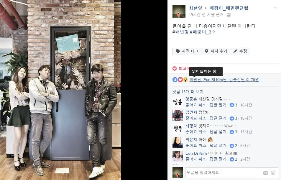 배짱이 팬클럽이라는 페이스북 그룹도 있는데 여기서 배민과 관련된 여러 배짱이들의 사진과 얘기들이 오고 간다.