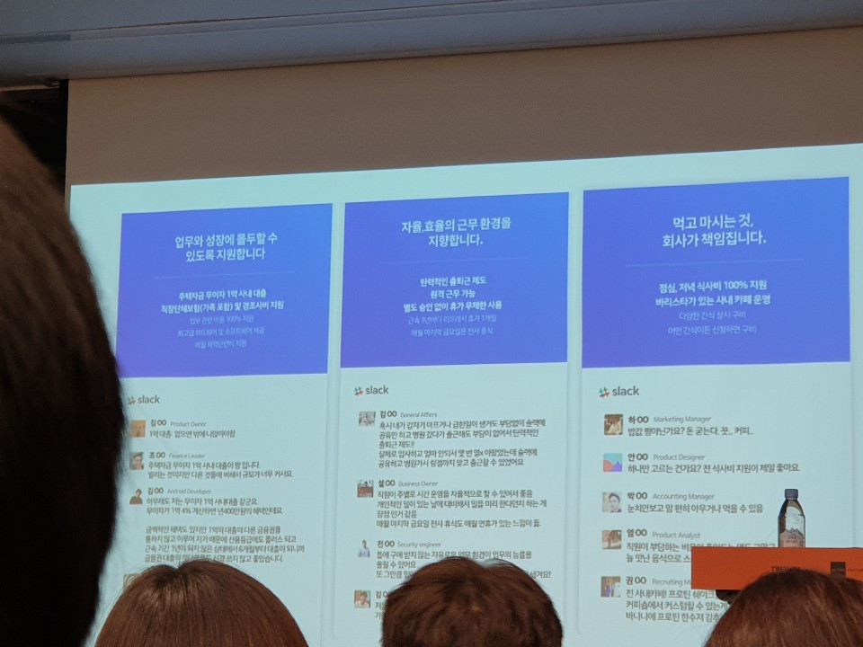 매달 회사의 현금 흐름과 매출, 1인당 사용하는 카드 내역 지출이 다 공개. 규칙을 없앤다. 더 투명하게 만든다. 업무 외 신경쓰게 만드는 모든 요소들을 제거하는 것은 회사의 일이다. 전세 자금 이런 것들에 대해서 굉장히 스트레스 받는 걸 봤다. 우리 패키지 프로그램 중 모든 임직원들에게 1억을 무료로 대출. 주택에 고민을 덜어드리기 위해서. 자꾸 카페가서 일하고 싶어하길래 카페를 회사에 만들고.. 스타킹 사러 편의점 가길래 여성분들이 회사에 편의점을 만들었다.