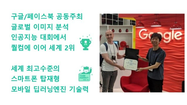 또 실시간 음성번역 서비스도 직접 최초로 만들었다. 게다가 다양한 인공지능 기술을 개발해 유저 경험을 최적화하고 풍부하게 만들고 있다. 구글/페이스북 공동 주최 글로벌 이미지 분석 인공지능 대회에서 퀄컴에 이어 전세계 2위를 했고 더 대단한건 유저가 앱을 쓰면 서버로 보내서 데이터를 처리하는데 우리는 이걸 앱에 그냥 심어서 데이터를 처리하고 있다. 이런 기술이 전세계에 몇 없다고 알고 있다.
