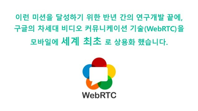 우리는 반년동안 연구 개발을 했고 구글이 오픈 소스로 개발한게 있는데 (WebRTC) 이게 원래 웹에서 돌아가는데 앱에서 이걸 전세계 최초로 구현했다. 우리 앱에서 하루 7천만건의 영상 통화를 전 세계에 제공하고 있다. 이는 세계 최대 규모고 페이스북 규모랑 맘먹는다.