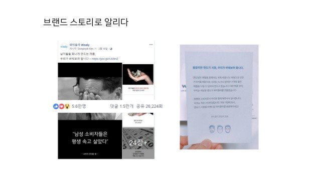 남들처럼 광고도 해보고 했는데 우리 브랜드 스토리를 알리면 어떨까? 내가 불편해서 창업을 했습니다. 이게 더 공감을 할 수 있다고 봤다. 댓글이 1.5만개, 라이크 5만개, 공유 27,000개. 작은 스타트업으로는 굉장히 큰 관심. 우리 패키지를 보면 우리 창업 스토리가. 처음에 콘텐츠가 반응이 좋아 되게 좋다고 생각했는데 좋지만 않다고도 생각했다. 동시에 주문량이 급증, 물류센터 마비 초기 예상했던 것보다 10배 이상 수요. 재고를 주문할 돈이 없더라. 결제 조건 때문에 계속 발로 뛰었다. 고객 반응들을 보면서 2개월 지나니깐 면도기 브랜드 중 네이버 검색량 1위를 달성. 질레트 대비 1.5배 검색량이 지속적으로 유지. 우리가 시장에 진입한지 얼마안됬지만 사람들이 충분히 관심을 갖고 있으니 더 큰 변화를 만들 수 있겠구나.