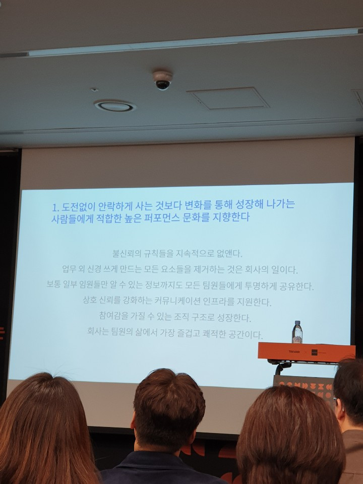 핵심가치는 채용, 평과와 보상, 토사와 승진의 핵심 기준이 될 때에만 지켜줄 수 있다. 우리는 기업 기준을 15명일 때 만들었다. 이렇게만 하면 성공하더라. 변화를 만들고 높은 성취를 하더라. 우리 코어벨류를 정했다. 내가 생각하는 기업 문화는 고성과를 낼 수 있는 원칙과 문화. 이걸 모든 팀원들이 보게.