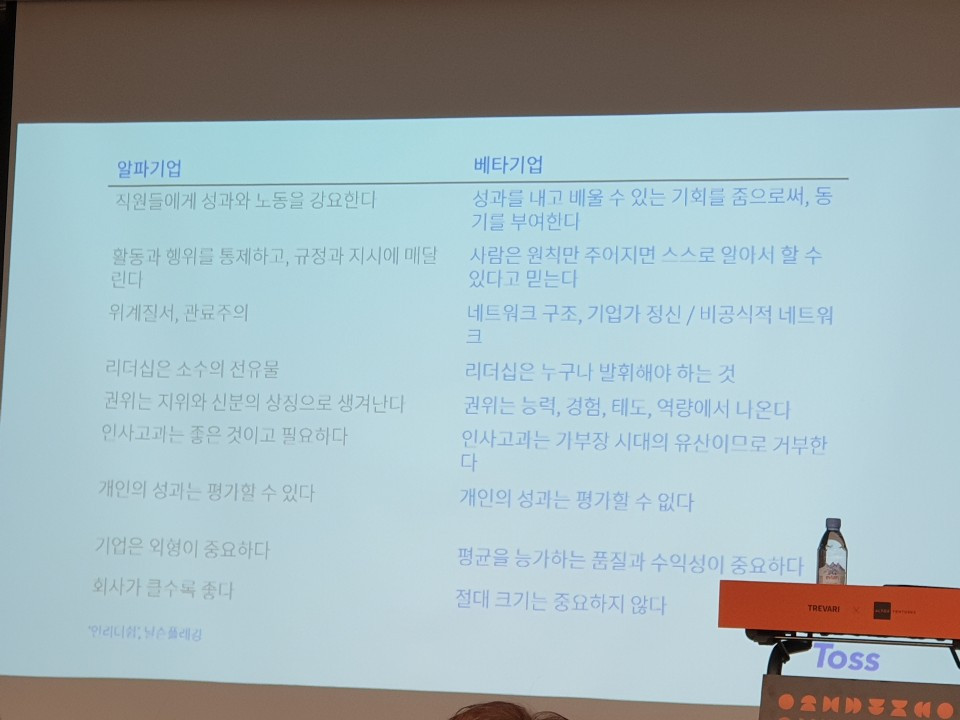 토스 : 스티브 잡스가 어떻게 애플은 매년 혁신할 수가 있는가 에 대해서 우리는 시스템을 만들지 않는다. 우리는 좋은 사람을 채용한다라고 한다. 우리는 이런 쪽에 가깝고 이 모델이 더 빠르고 확장가능하다. 이 문화를 지키기 위해 자신의 잡으로 생각하고 일을 하기 때문에 유지가 가능하고 물론 구간마다 정체가 생긴다. 근데 그때 프로세스를 만들고 규칙을 만들지 않는다. 문제가 있는 사람은 2군으로 만드는게 우리의 원칙이다.