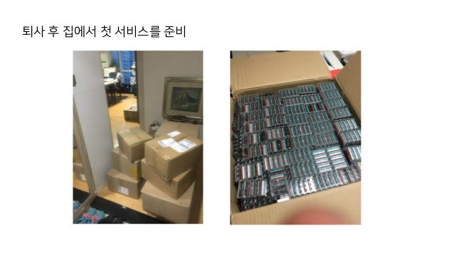 퇴사 후 집에서 첫 서비스를 준비했다. 3천만원치 면도날을 집으로 시켰다. 박스 접고 택배 붙이고 전화받고. 이때 너무 바빠서 항상 전화오고 택배 겨우 붙이고 첫끼가 저녁 8시였다. 험블하게 집에서 시작했다. 2개월정도 장사를 하니깐 사람들이 정말로 필요로 하구나.