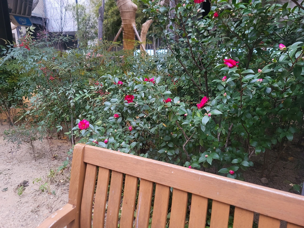 이러한 줌 피로 증후군을 날려버린 노하우를 소개해 보겠다. 먼저 사진에서 보듯 원두 하나하나를 정성껏 로스팅하는 핸드드립 전문점에 가서 따뜻한 카푸치노를 마신다. 붐비는 주차장에 주차를 하는 수고를 마다하지 않고 같이 커피를 마시는 친구가 있다면 커피 향은 더 그윽해진다. 다음으로 도심 속에서 전망대 뷰를 즐길 수 있는 높은 곳으로 간다. 등산 후 정상에서 느끼는 뿌듯함과 조금은 닮은 느낌이다. 산에서 볼 수 있는 색감 좋은 꽃도 볼 수 있다면 묵직한 두통을 안겨준 스트레스는 어느새 저만치 달아나 있다. 꽃의 색감과 은은한 향기는 뇌에 긍정적인 자극을 줘서 스트레스를 완화해 정서적 안정감을 준다. 윤기 나는 도톰한 녹색 잎 사이에서 찬바람을 맞으며 피어있는 붉은 동백꽃은 강단 있어 보인다.