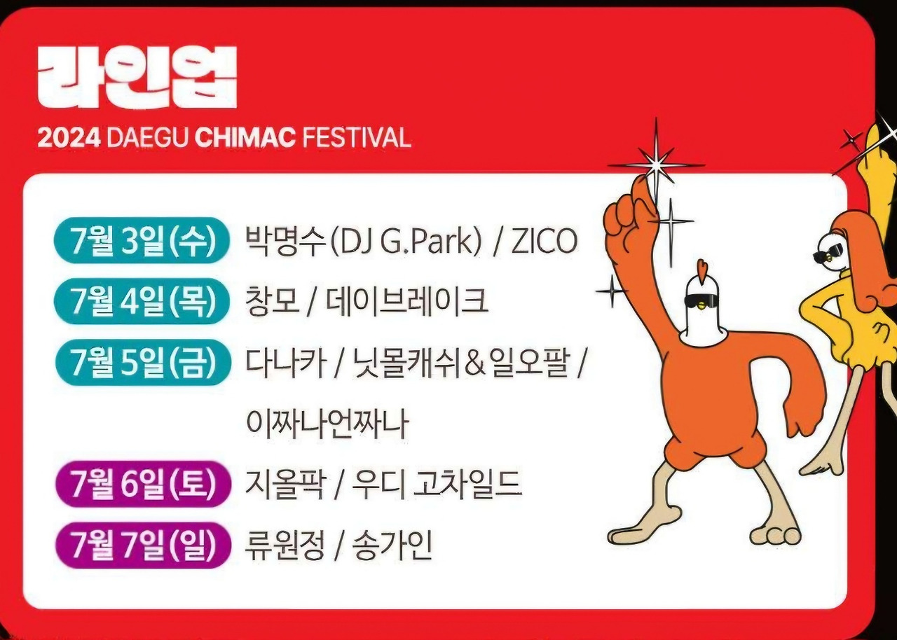 올해는 유난히 더위가 일찍 시작되어 6월 초에 폭염주의보가 떴다. 대프리카라는 명성에 걸맞게 7월 들어서는 최고 기온이 37도를 넘나 든다. 장마철 높은 습도까지 더해져서 에어컨 없이는 일상생활이 어려울 지경이다. 더운 데 뭣 하러 가서 땀 흘리며 치킨을 먹지?라는 생각에 한 번도 가지 않았다. 하지만 해마다 높아지는 기온을 고려하면 올해가 제일 시원할 듯했다. 무엇보다 더위 따위는 아랑곳 않고 음악을 즐길 줄 아는 지인이 있어서 페스티벌에 함께 참여하기로 했다.