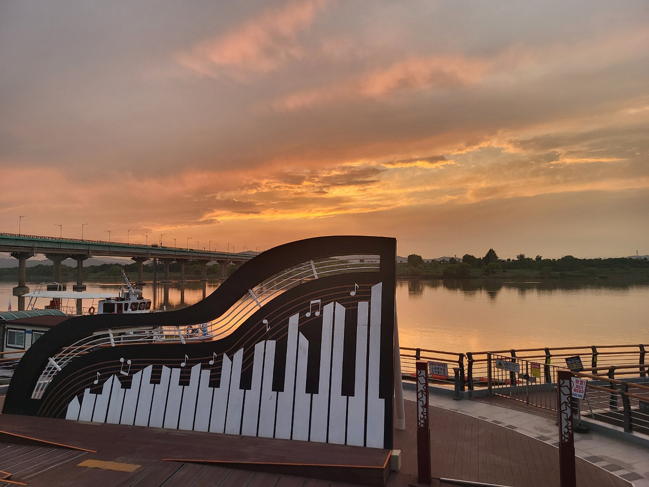 사문진의 대표적인 풍경은 아래 사진에 있는 피아노 모형과 노을이 어우러진 낙동강의 모습이다. 나루터에 어째서 피아노 모형이 있을까 의아할 것이다. 역사를 살펴보면 사문진은 피아노와 관련이 깊은 곳이다. 1900년 미국 선교사 부부가 최초로 한국에 피아노를 들여왔다. 낙동강 배편으로 실어와서 3일 동안 인부들의 도움을 받아 약전골목의 선교자 자택으로 가까스로 옮길 수 있었다. 힘들게 피아노를 옮겨 온 선교사 부부들의 노력에 정말 감탄했다. 동시에 현재의 빠른 택배서비스가 얼마나 고맙고 편리한 것이지 다시 생각해 보게 되었다.