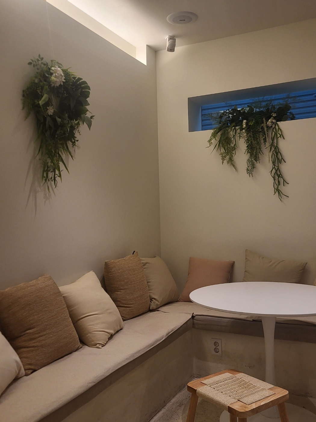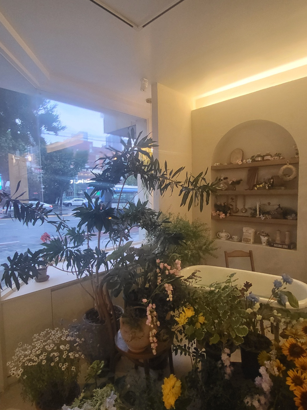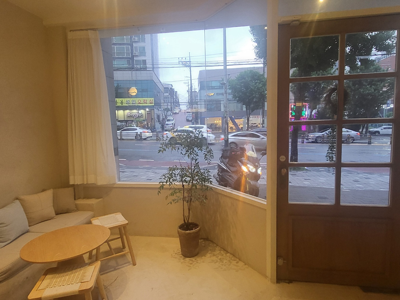 사장님의 인테리어 감각 덕분에 카페 전체가 화이트톤에 그린이 조화롭게 구성되어 있었다. 은은한 간접조명이 비추고 있어 흰색 벽이 따뜻해 보였다. 좌석마다 개성이 있어서 올 때마다 다른 기분을 낼 수 있는 곳이기도 하다. 대로변에 있어서 찾기 쉽고 널찍한 통창 너머로 보이는 거리풍경이 시원스럽게 들어온다.