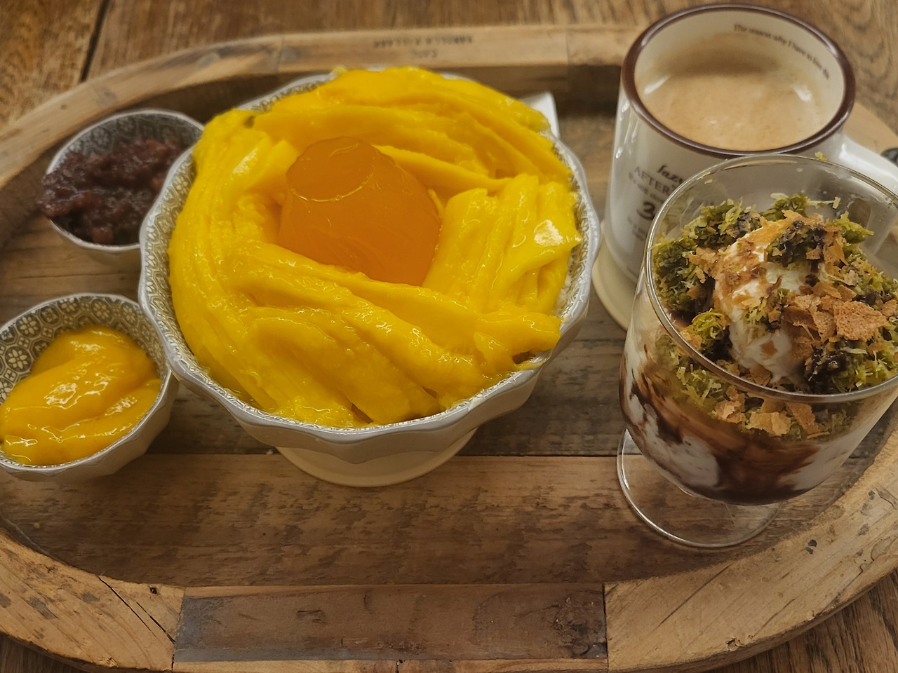 스튜디오 촬영 시 볼 수 있는 꽃 욕조를 갖추고 사계절 테마를 바꿔가며 인테리어를 하는 감성 카페가 대구에 있어서 소개해볼까 한다. 대구 시내인 동성로에서 그리 멀지 않은 곳에 위치한 Vanilla Village는 인테리어뿐만 아니라 다양한 베이커리 메뉴가 있어서 비 오는 날 저녁에도 손님이 많았다. 망고 빙수는 생망고수제푸딩을 가운데 얹고 생망고를 정성스럽게 담은 모습이라 먹기 아까웠다. 사진을 여러 장 찍고 또 찍었다. 망고연유시럽과 통팥도 색을 맞춘 앙증맞은 그릇에 담아서 원목 트레이에 얹으니 정성스러운 대접을 받는 느낌이 들어 기분이 좋아졌다. 요즘 인기 있는 두바이초콜릿 역시 예쁘고 피스타치오도 듬뿍 담겨 있어 맛있게 먹었다. 따뜻한 라떼는 향이 그윽했다.