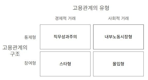 저는 제가 회사 생활을 하는 내내 조직의 성격을 몰입형으로 만들고 싶었습니다. 그것이 과업에 있어서의 진정성을 실현하는 방법이라고 생각했기 때문입니다. 하지만, 책에서 설명하는 바와 같이 우리나라의 기업은 직무성과주의와 내부노동시장형이 많습니다. 이런 역사적인 증거들을 통한 기업의 성격은 '일'이 어떻게 정의되고 의미를 가질 지에 대해 큰 영향을 미칩니다. 저는 이 책에서 큰 맥락 속에서 기업과 일을 바라보는데 큰 도움을 얻었습니다. 각 유형에 대한 친절한 설명을 원하시면 <인사이드 아웃>이라는 책을 추천해 드립니다. 픽사의 영화 <인사이드 아웃> 만큼 재미있습니다.