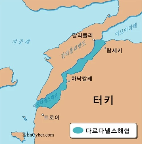 좀 더 설명하자면, 헬레스폰트 해협은 에게 해와 마르마라 해를 잇는 지금의 터키 해협으로, 현재 명칭은 다르다넬스 해협이다. 길이는 61킬로미터이지만 폭은 1~6킬로미터 밖에 되지 않는다. 평균 깊이는 55미터이고, 가장 깊은 곳은 81미터다. 페르시아 제국의 크세르크세스 1세와 마케도니아 왕국의 알렉산드로스 대왕은 정복을 위해 이 해협을 건넜고, 비잔티움 제국에게 이 해협은 콘스탄티노폴리스를 지키는 아주 중요한 길목이기도 했다.(출처: 위키백과)