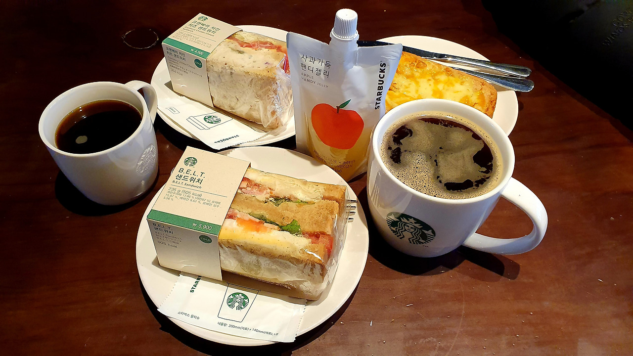 참고로 우리 가족은 한 달에 두 번 정도는 스타벅스에서 브런치를 한다. 물론 내가 사는 것이다. KB국민카드에서 가입자 유치를 위해 파격적인 할인 조건(스타벅스 50% 월 최대 2만 원 한도)으로 온라인에서만 발급하는 것을 포착해 발급받았다. 샌드위치 3개와 커피 2잔, 음료 1잔을 만원 정도에 먹을 수 있어 가성비가 굉장히 좋다. 주말 아침에 식사를 준비하는 고단함과 설거지의 번거로움에서 벗어날 수 있어 난 가족에게 한 달에 2~3번은 호기롭게 외친다. "아빠가 오늘 아침은 쏜다"라고.